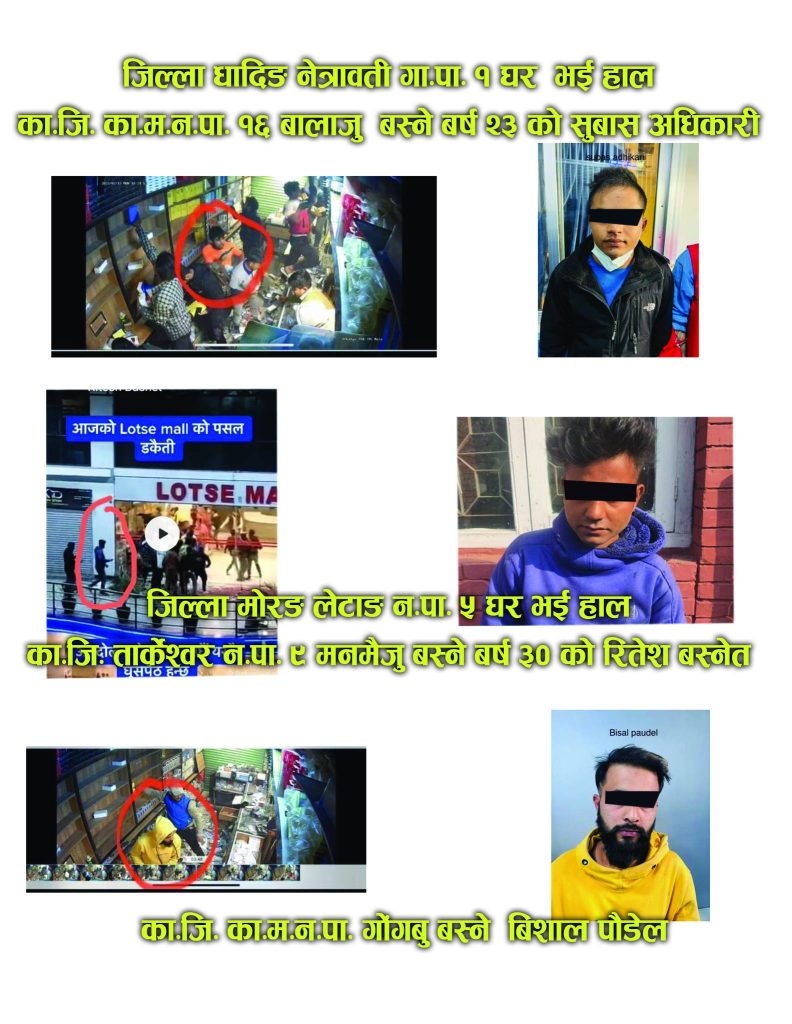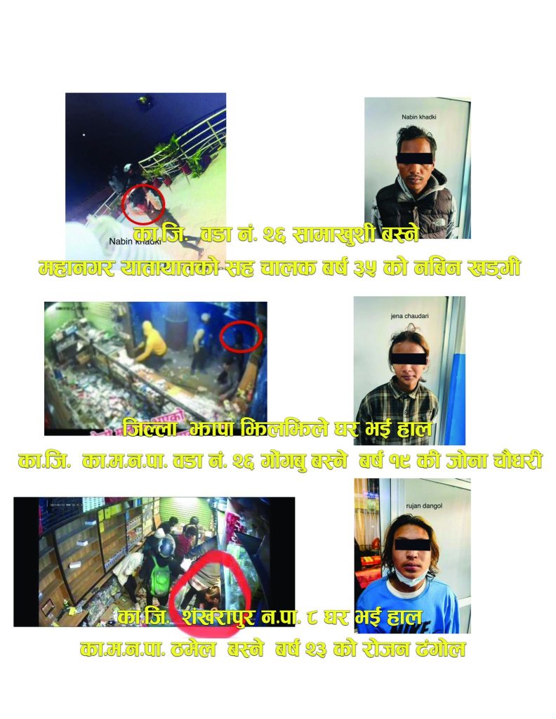 पक्राउ पर्नेमा काठमाडौंको शंखरापुर नगरपालिका वडा नं. ८ घर भई हाल ठमेलमा बस्ने (बसमा यात्रु हाल्ने काम गर्ने) वर्ष २३ का रोजन डंगोल, गोरखाको अजिरकोट ३ हंसपुर घर भई हाल माछापोखरी बस्ने (लगेज बोक्ने भरिया काम गर्ने) वर्ष ३० को सुजन तामाङ, धादिङको नेत्रावती १ घर भई हाल काठमाडौंको बालाजु बस्ने (न्यु भण्डारी खाना घरमा खाना पकाउने काम गर्ने) वर्ष २३ को सुवास अधिकारीलाई प्रहरीले पक्राउ गरेको छ ।