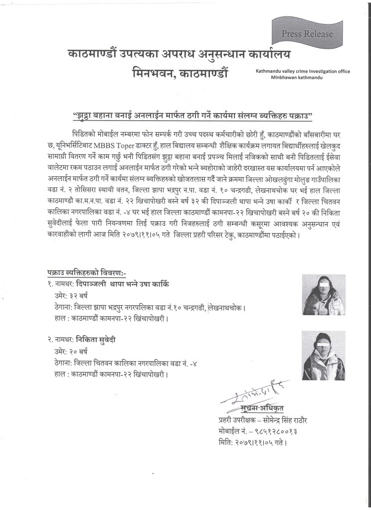 पक्राउ पर्नेहरूमा झापा भद्रपुर नगरपालिका–१० चन्द्रगढी लेखनाथचोक घर भई काठमाडौं महानगरपालिका–२२ खिचापोखरी बस्ने ३२ वर्षीया दीपाञ्जलि थापा भन्ने उषा कार्की र चितवनको कालिका नगरपालिका–४ की २० वर्षीया निकिता सुवेदी रहेको प्रहरीले जनाएको छ ।