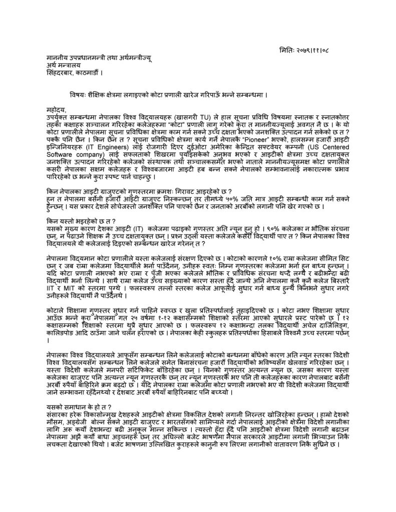 कोटा प्रणाली खारेज गरी नेपाललाई आइटी शिक्षाको हब बनाउन माग