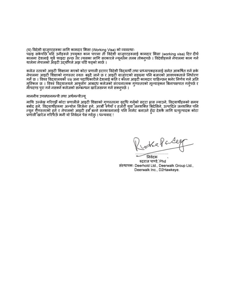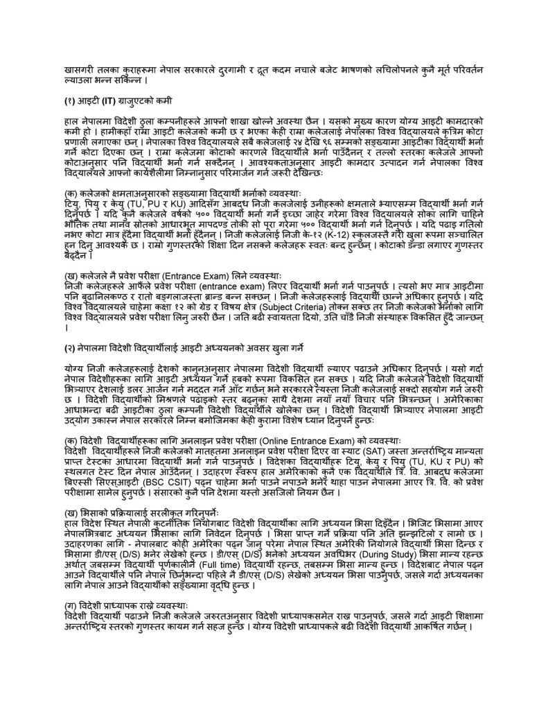 ज्ञापनपत्रमा नेपालमा विदेशी विद्यार्थीलाई आइटी अध्ययनको अवसर खुला गर्नका लागि अनलाइन प्रवेश परीक्षाको व्यवस्था गर्न, भिसा प्रक्रियालाई सरलीकृत गर्न, विदेशी प्राध्यापक राख्ने व्यवस्था गर्न तथा नेपालबाट उच्च शिक्षा प्राप्त गरेका विदेशी विद्यार्थीको लागि कामदार भिसाको व्यवस्था गर्न पनि सुझाव दिइएको छ ।