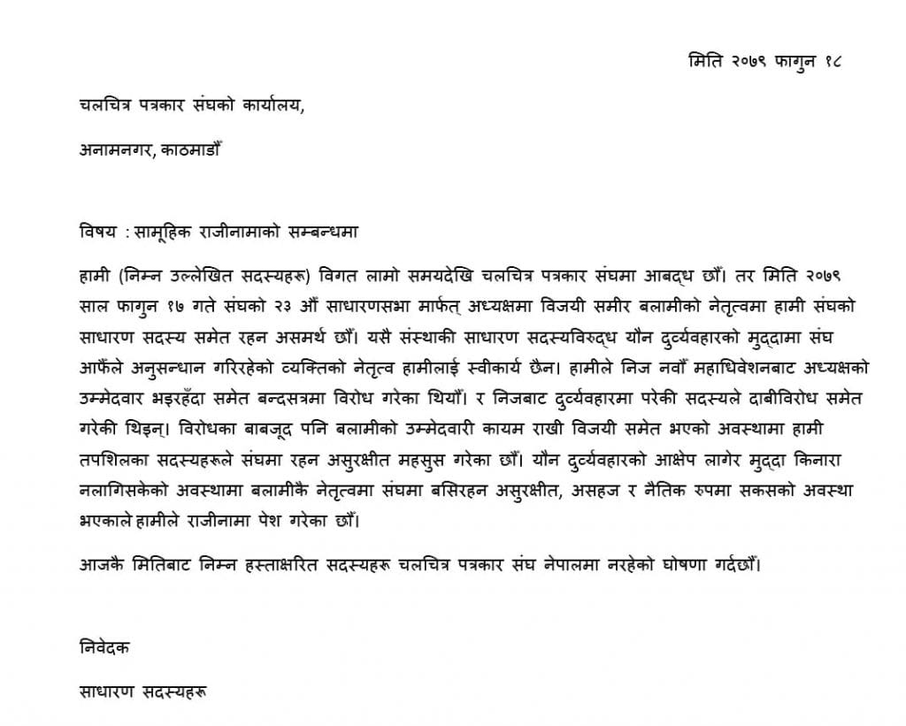अध्यक्ष बलामीले राजीनामा पत्र चलचित्र पत्रकार संघमा आइनपुगेको विभिन्न सञ्चारमाध्यमलाई प्रतिक्रिया दिएका छन् ।