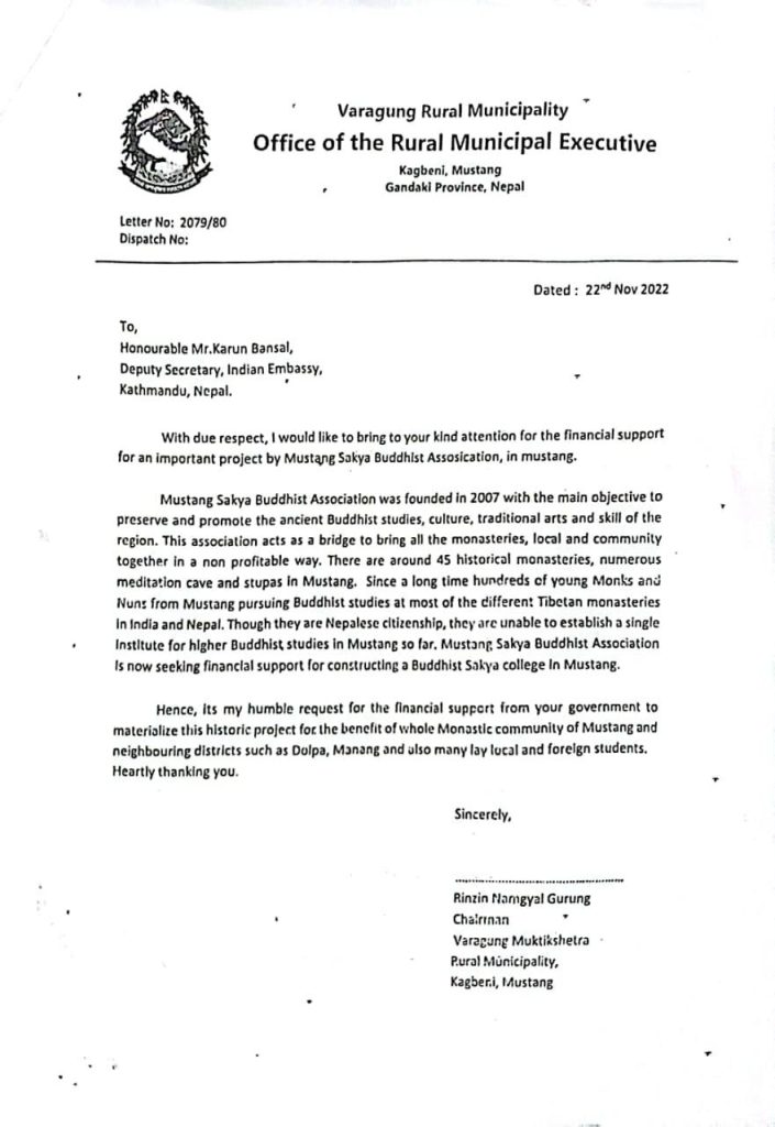 एमालेबाट निर्वाचित मुस्ताङको वारागुङ मुक्तिक्षेत्र गाउँपालिकाका अध्यक्ष रिङजीन नामगेल गुरुङले मुस्ताङ शाक्य बुद्धिष्ट एसोसिएसनले बौद्ध शाक्य कलेज स्थापना गर्न आर्थिक सहयोग खोजिरहेको भन्दै त्यस्तो संस्था स्थापनाका लागि आर्थिक सहयोग गर्न करिब साढे तीन महिनाअघि काठमाडौंस्थित भारतीय दूतावासमा आग्रह गरेका हुन् ।