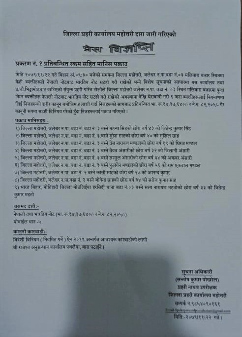 जिल्ला प्रहरी कार्यालय महोत्तरीका सूचना अधिकारी तथा डीएसपी सन्तोषकुमार पोखरेलद्वारा सोमबार जारी विज्ञप्तिमा प्रतिबन्धित भारतीय रुपियाँका नेताहरूसहित १४ लाख ३७ हजार ६४० रुपियाँसहित मानिसहरू पक्राउ गरिएको छ ।
