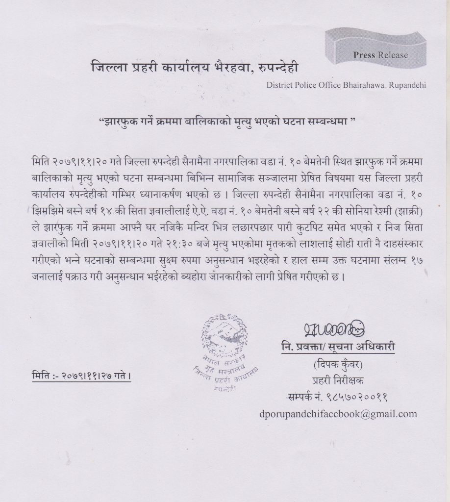 रुपन्देहीको सैनामैना नगरपालिका वडा नं. १० निवासी १४ वर्षीया बालिका सीता ज्ञवालीलाई लछारपछार गरि कुटपिट समेत गरेर हत्याको अभियोगमा सोनियालाई पक्राउ गरिएको निमित्त प्रवक्ता (ईन्स्पेक्टर) दीपक कुँवरद्वारा जारी विज्ञप्तिमा उल्लेख छ ।