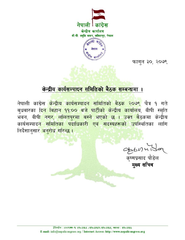 बैठक बुधबार बिहान ११ बजे केन्द्रीय कार्यालय ललितपुरमा बस्नेछ । सभापति शेरबहादुर देउवाले राजनीतिक अवस्थाका बारेमा रणनीति बनाउने बैठक बोलाएका हुन् ।