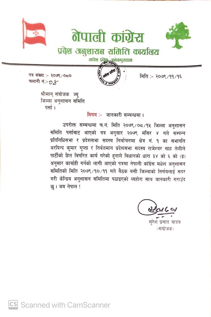 समितिले पर्सा जिल्लाको प्रदेश सभा निर्वाचन क्षेत्र नं. १ का सभापति अरविन्दकुमार गुप्ता र प्रदेश सभाका पूर्व सांसद राजेश्वर साह तेलीलाई अनुशासनको कारबाही गरेको हो ।