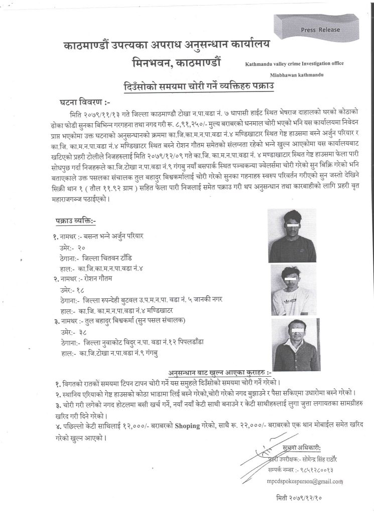 सूचना अधिकारी तथा प्रहरी उपरीक्षक सोमेन्द्रसिंह राठौरले काठमाडौंको धापासी हाइटस्थित भेषराज दाहालको कोठाको ढोका फोडेर विभिन्न गरगहना तथा नगद गरि ८ लाख ९१ हजार २५० मूल्य बराबरको धनमाल चोरी गरेको अभियोगमा तीन जनालाई पक्राउ गरिएको बताएका छन् ।