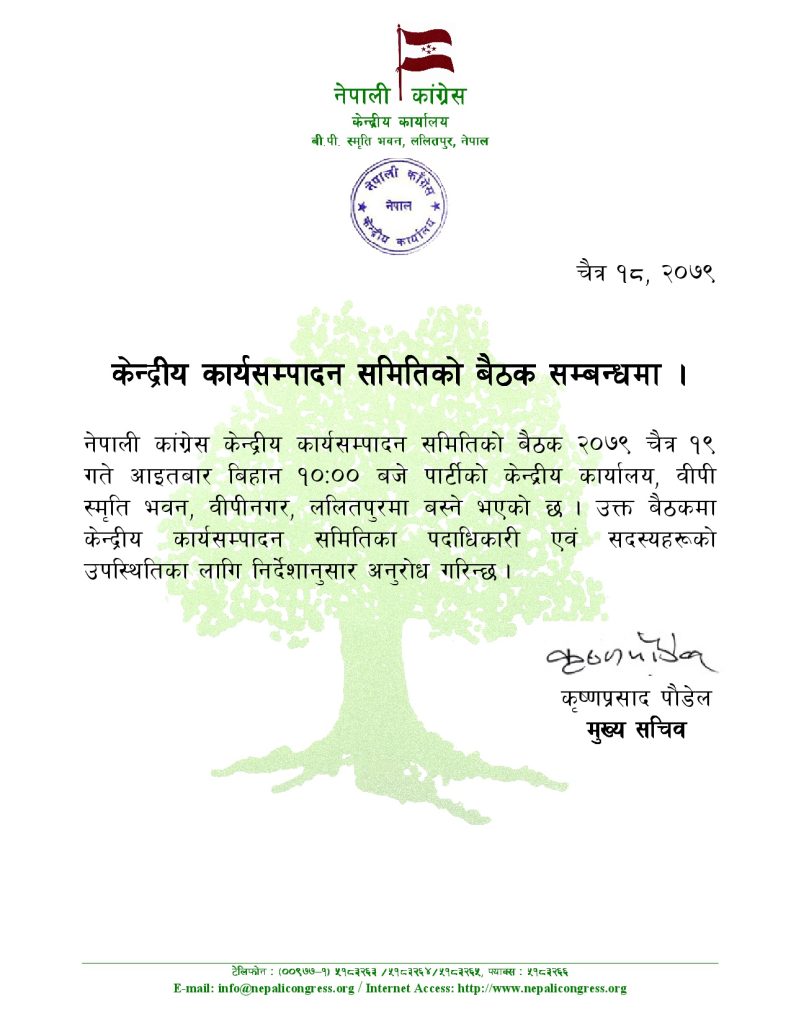 शनिबार कांग्रेस केन्द्रीय कार्यालय, सानेपा, ललितपुरका मुख्य सचिव कृष्णप्रसाद पौडेलले विज्ञप्ति जारी गरेर आइतबार चैत १९ गतेका लागि बैठक बोलाएका हुन् ।