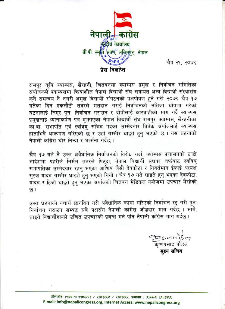 कांग्रेसले विज्ञप्ति जारी गरेर भनेको छ, ‘रामपुर कृषि क्याम्पस, खैरहनी, चितवनमा क्याम्पस प्रमुख र निर्वाचन समितिका संयोजकले क्याम्पसमा क्रियाशील नेपाल विद्यार्थी संघ लगायत अन्य विद्यार्थी संस्थासँग कुनै समन्वय नै नगरी अमुख विद्यार्थी संगठनको पक्षपोषण हुने गरी २०७९ चैत्र १७ गतेका दिन एकलौटी तवरले मतदान गराई निर्वाचनको नतिजा घोषणा गरेको घटनालाई लिएर पुन: निर्वाचन गराउन र दोषीलाई कारवाहीको माग गर्दै क्याम्पस प्रमुखलाई ध्यानाकर्षण पत्र बुझाएका नेपाल विद्यार्थी संघ रामपुर क्याम्पस, खैरहनीका का.वा. सभापति एवं स्ववियु सचिव पदका उम्मेदवार विवेक अर्याललाई क्याम्पस हाताभित्रै आक्रमण गरिएको छ ।’