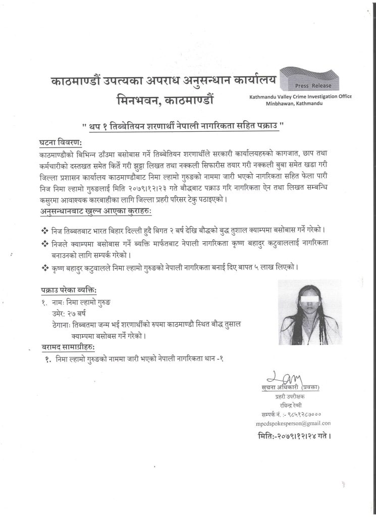 तिब्बतीयन नागरिक निमालाई नेपाली नागरिकता लिएको आरोपमा चैत २३ गते बौद्धबाट प्रहरीले पक्राउ गरेको विज्ञप्तिमार्फत जनाएको छ ।