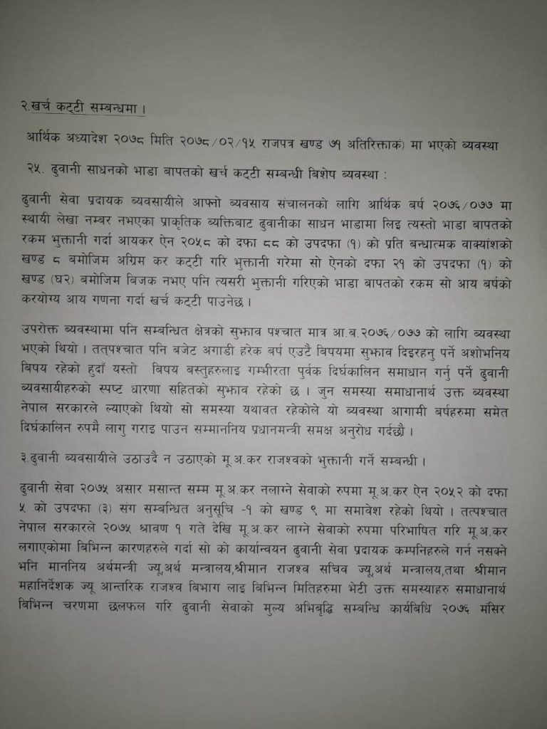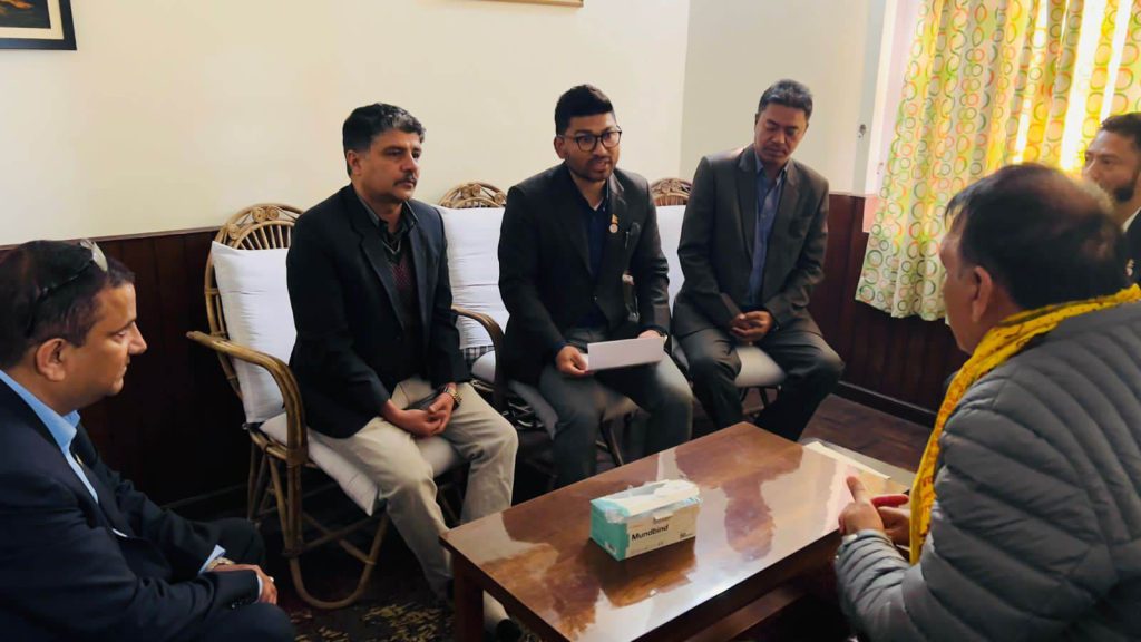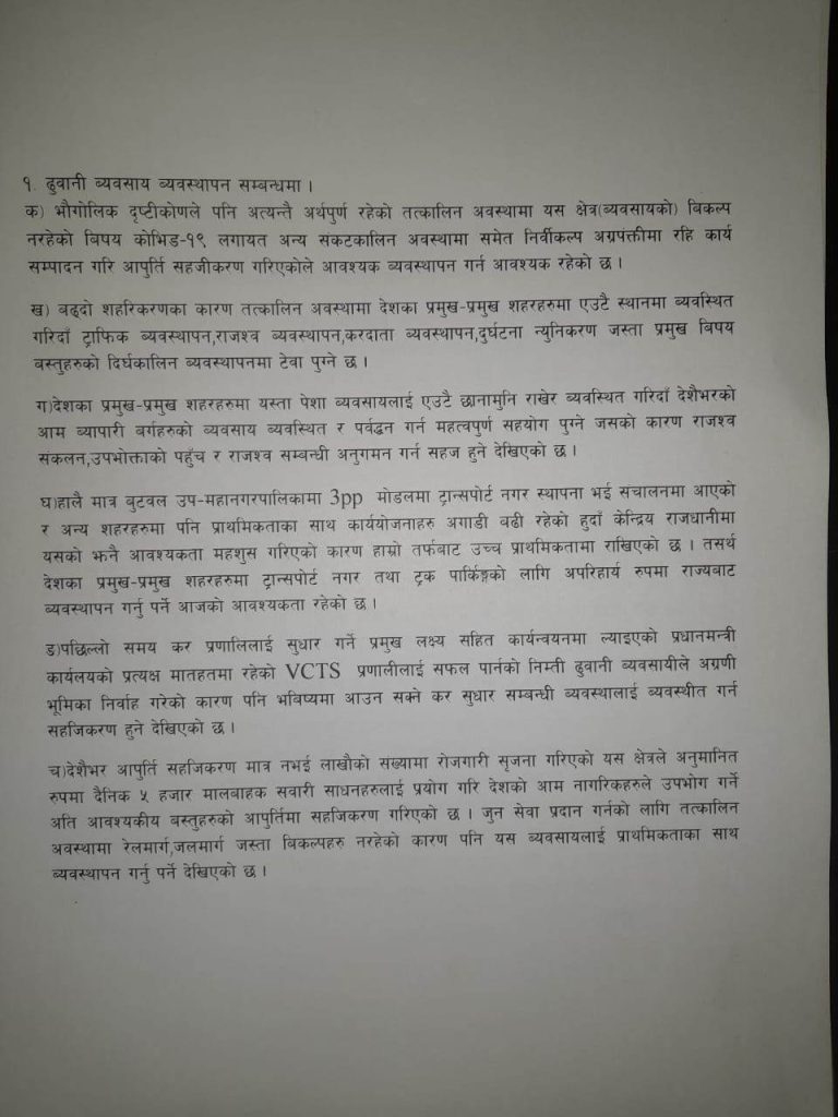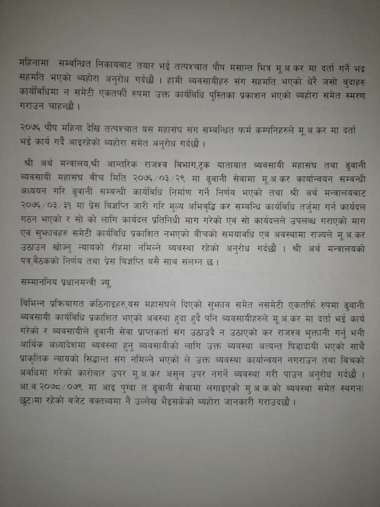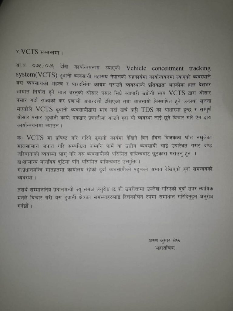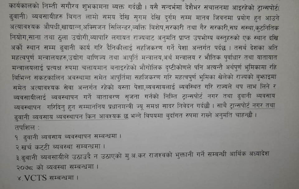 महासचिव श्रेष्ठले भने, ‘अर्थमन्त्री डा.प्रकाशशरण महतज्यू समक्ष दुवानी व्यवसाय व्यवस्थापन, खर्च कट्टी व्यवस्था, ढुवानी व्यवसायीले उठाउँदै नउठाएको मूल्यअभिवृद्धि कर राजश्वको भुक्तानी गर्ने सम्बन्धी आर्थिक अध्यादेश २०७८ को व्यवस्थापन र भीसीटीएस सम्बन्धी समस्याको समाधानबारे माग पत्र बुझाएका छौँ ।’