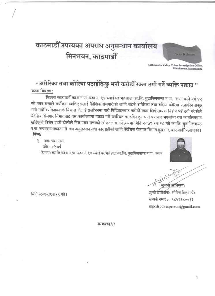 उनलाई पक्राउ गरी उपस्थित गराउन वैदेशिक रोजगार विभाग बुद्धनगर काठमाडौंबाट पत्राचार भएपछि काठमाडौं उपत्यका अपराध अनुसन्धान कार्यालय, मीनभवनबाट खटिएको प्रहरीले काठमाडौंको लाजिम्पाटबाट पक्राउ गरेको हो ।