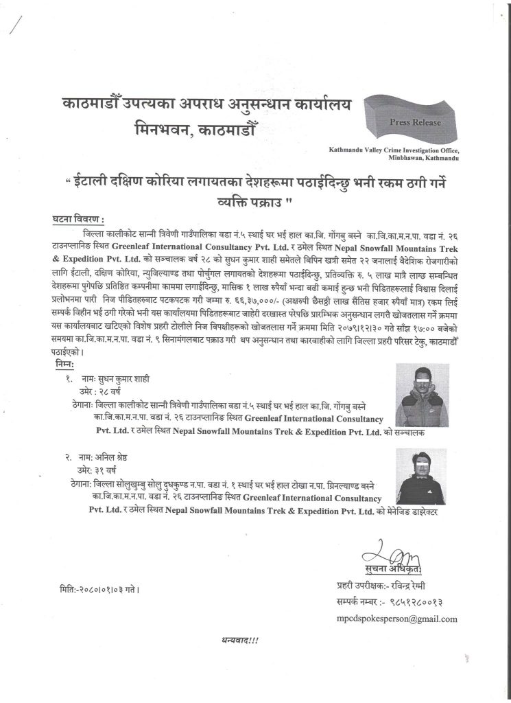 पक्राउ पर्नेहरूमा काठमाडौं महानगरपालिका–२६ टाउनप्लानिङस्थित ग्रिनलिफ इन्टरनेशनल कन्सलटेन्सी प्रालि र काठमाडौंको ठमेलस्थित नेपाल स्नोफल माउण्टेन्स ट्रेक एण्ड एक्सपेडिसन प्रालिका संचालक कालीकोट सान्नी त्रिवेणी गाउँपालिका–५ घर भएका २८ वर्षीय सुधनकुमार शाही र मेनेजिङ डाईरेक्टर सोलुखुम्बुको सोलु दुधकुण्ड नगरपालिका–१ घर भई हाल काठमाडौंको टोखा नगरपालिका ग्रिनल्याण्ड बस्ने ३१ वर्षीय अनिल श्रेष्ठ रहेका छन् ।