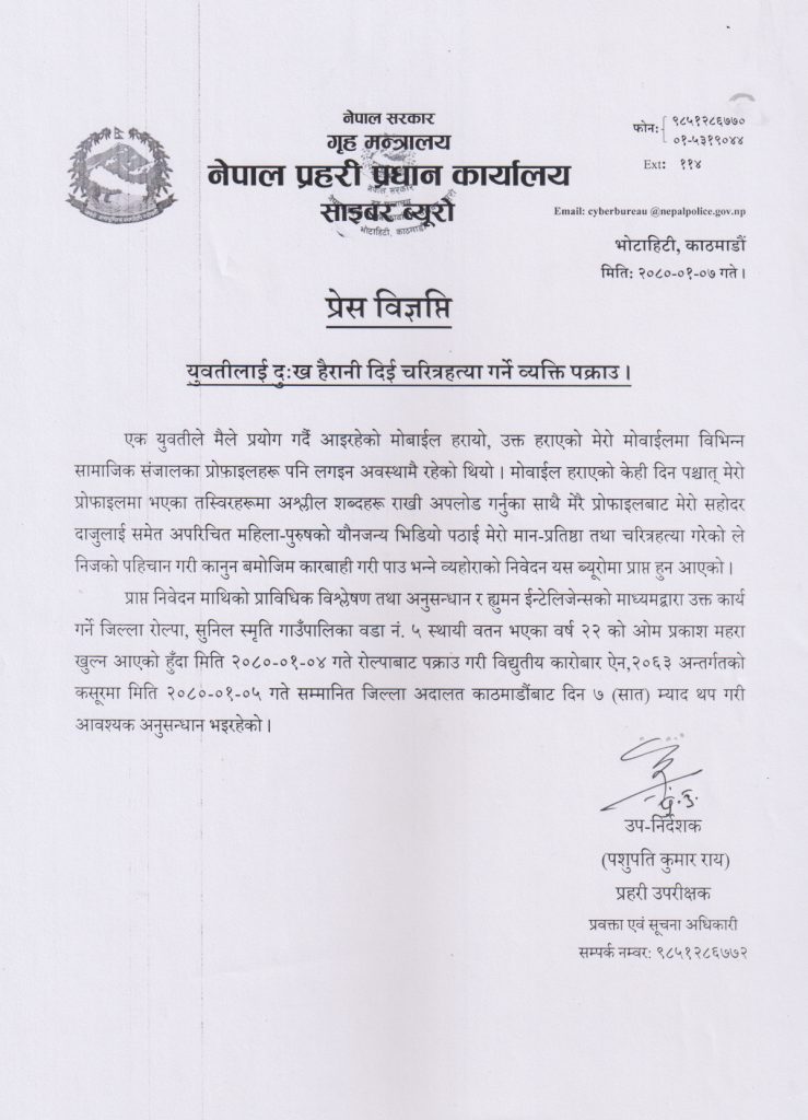 पीडित युवतीको उजुरीको आधारमा साइबर ब्यूरोबाट खटिएको प्रहरीले अनुसन्धानको क्रममा महराको संलग्नता रहेको खुल्न आएपछि रोल्पाबाट पक्राउ गरेको विज्ञप्तिमा उल्लेख छ ।