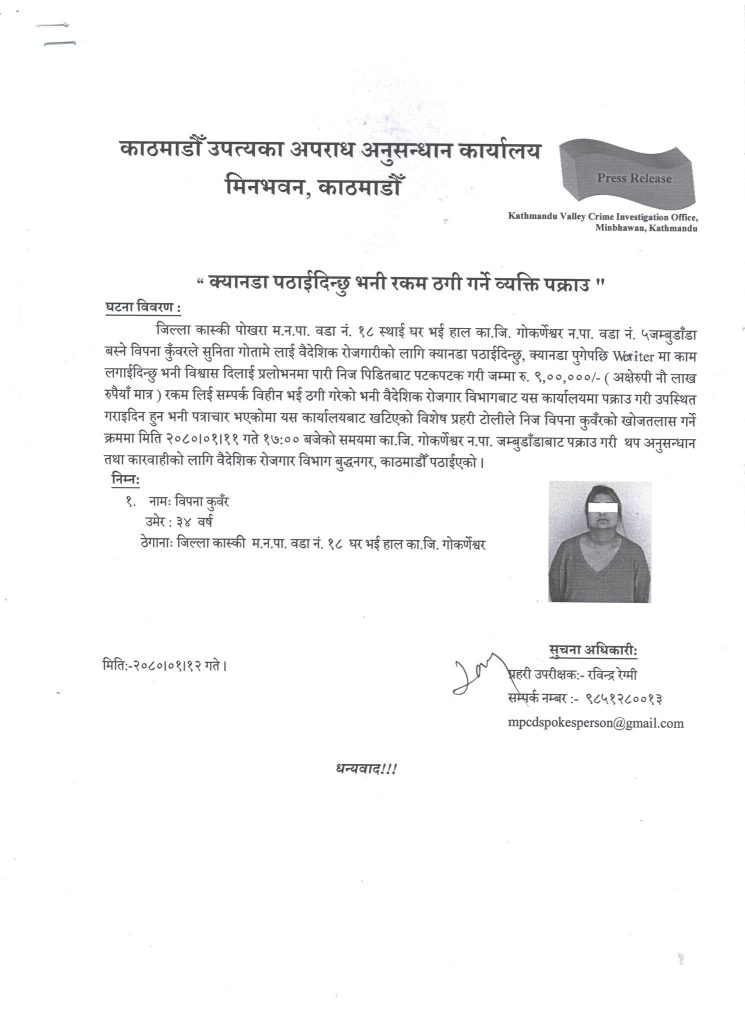कास्कीको पोखरा महानगरपालिका वडा नं. १८ स्थायी घर भइ हाल काठमाडौंको गोकर्णेश्वर नगरपालिका वडा नं. ५ जम्बुडाँडा बस्दै आएकी विपनालाई पक्राउ गरेको विज्ञप्तिमा उल्लेख छ । उनलाई प्रहरीले सोमबार साँझ जम्बुडाँडाबाट पक्राउ गरेको हो ।