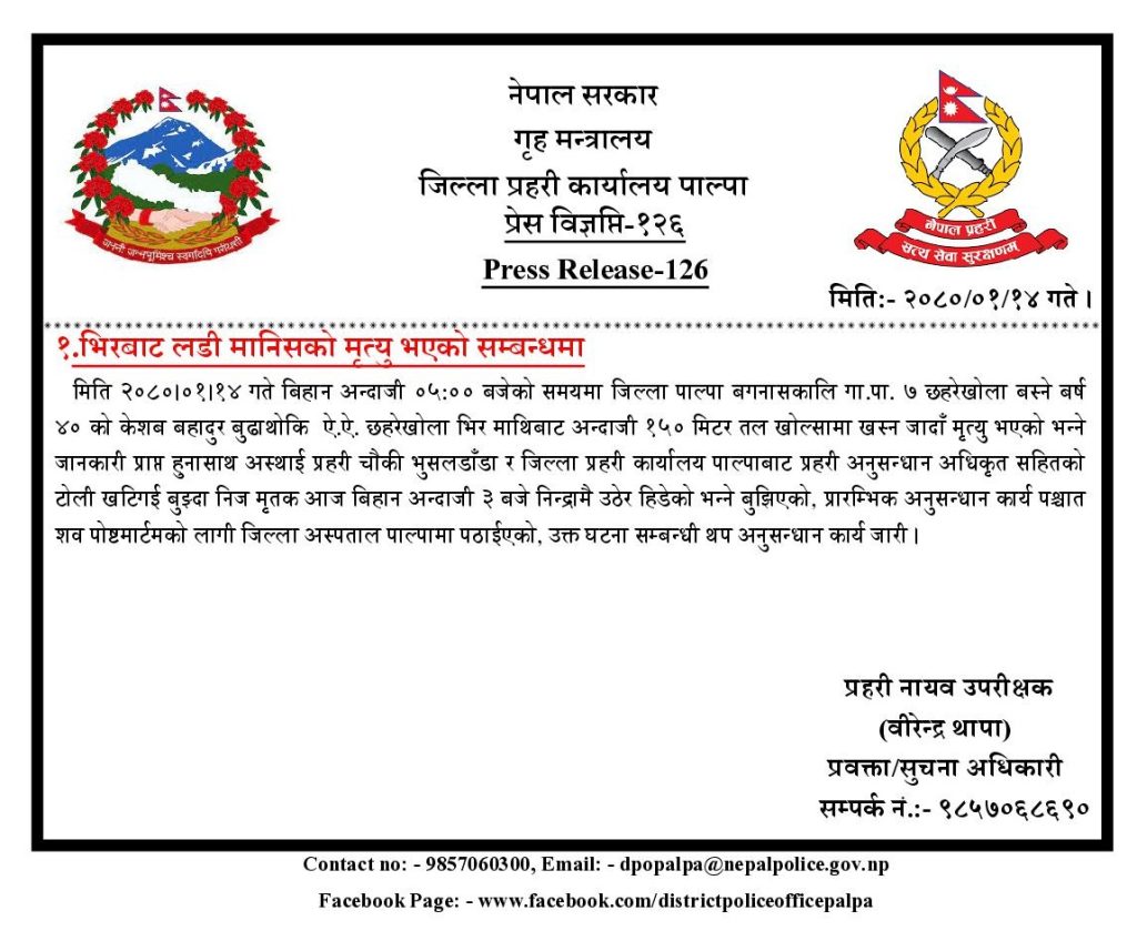 विज्ञप्तिमा भनिएको छ, ‘केशवबहादुर बुढाथोकी बिहीबार बिहान करीव ३ बजे निद्रामै उठेर हिँडेको भन्ने बुझिएको, प्रारम्भीक अनुसन्धान कार्य पश्चिात शव पोष्टमार्टमको लागि जिल्ला अस्पताल पाल्पा पठाइएको छ ।’