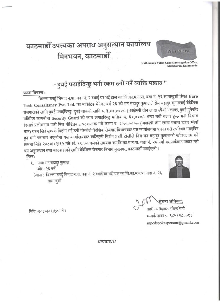 कठमाडौं महानगरपालिका–२६ स्थित यूरो टेक कन्सलटेन्सी प्रालिका मार्केटिङ मेनेजर कुमालले एक व्यक्तिलाई वैदेशिक रोजगारका लागि दुबइ पठाउने भनेर ठगी गरेका थिए ।
