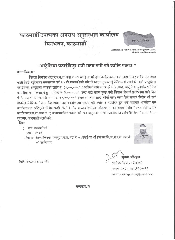 प्रलोभनमा पारी पीडितबाट पटक पटक गरी ३० लाख रूपियाँ लिई ठगी गरेकोले पक्राउ गरी उपस्थित गराउन प्रहरीलाई वैदेशिक रोजगार विभागबाट पत्राचार भएको थियो ।