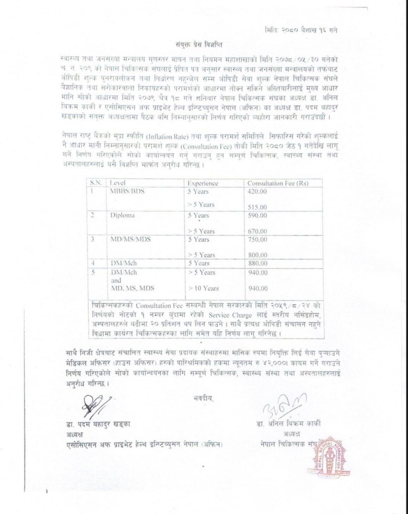 जेठ १ गतेदेखि लागू हुने गरी ओपीडीमा चिकित्सकको अनुभव र योग्यताका आधारमा रू.४२० देखि रू.९४० सम्म शुल्क लिन पाउने गरी निर्णय भएको चिकित्सक संघ र अफिनद्वारा जारी संयुक्त विज्ञप्तिमा उल्लेख छ ।