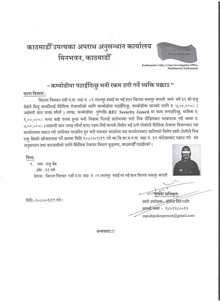 वैदेशिक रोजगारीका लागि कम्बोडीया पठाइदिन्छु भन्दै रकम ठगी गरेको अभियोगमा चितवनको राप्ती नगरपालिका–९ लालपुर घर भई हाल भक्तपुरको जगाती बस्ने श्रेष्ठलाई मंगलबार प्रहरीले पक्राउ गरेको विज्ञप्तिमा उल्लेख छ ।