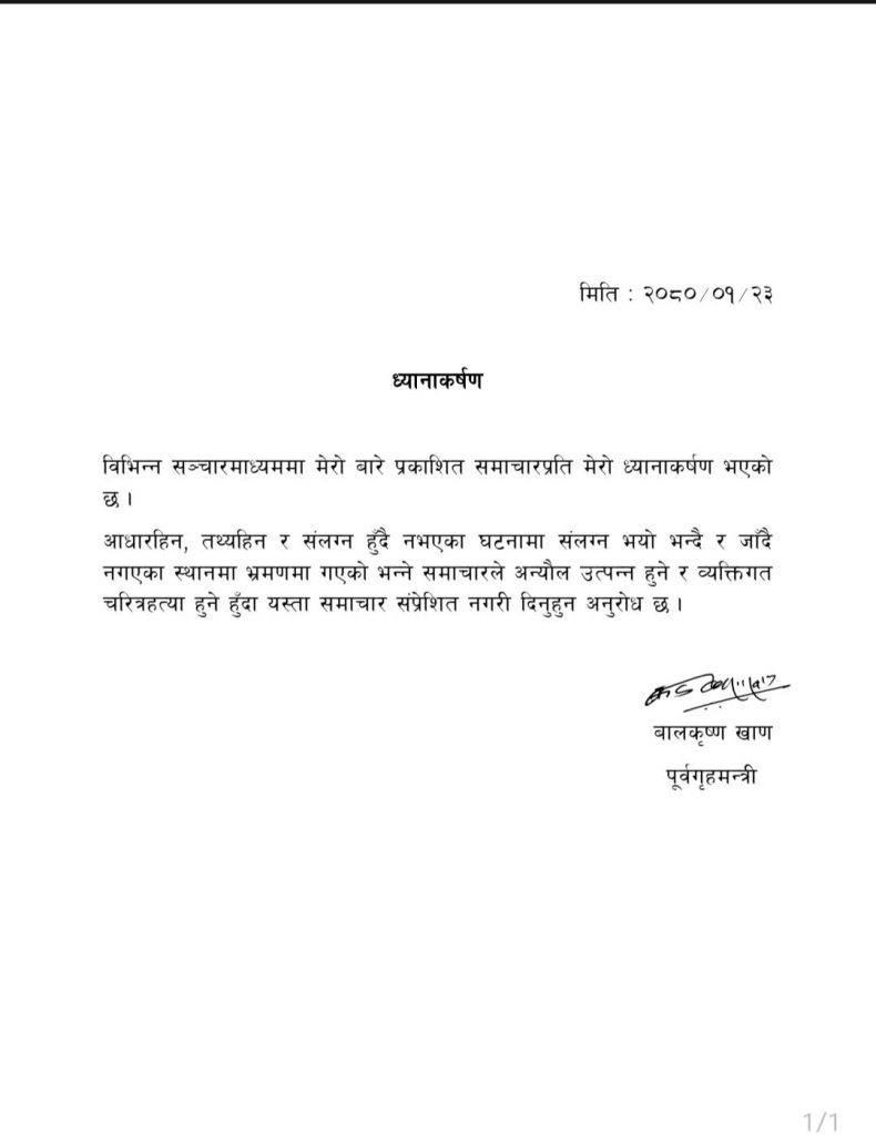 ‘आधारहीन, तथ्यहीन र संलग्न हुँदै नभएका घटनामा संलग्न भयो भन्दै र जाँदै नगएका स्थानमा भ्रमणमा गएको भन्ने समाचारले अन्यौल उत्पन्न हुने र व्यक्तिगत चरित्रहत्या हुने हुँदा यस्ता समाचार सम्प्रेशित नगरीदिनु हुन अनुरोध छ’, पूर्वगृहमन्त्री खाणले भनेका छन् ।