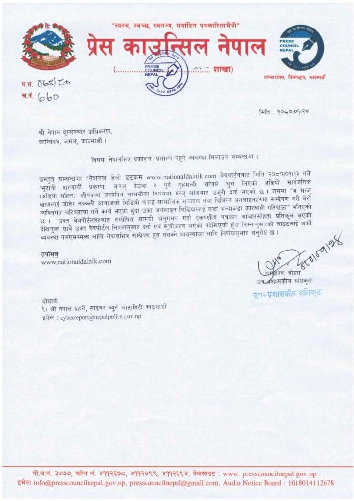 प्रेस काउन्सिलका उप–प्रशासकीय अधिकृत रामशरण बोहराले नेपाल दूरसञ्चार प्राधिकरणलाई पत्र लेखेर ‘नेशनल डेली डटकम’लाई नेपालभित्र अर्को व्यवस्था नभएसम्मका लागि प्रकाशन र प्रशारण बन्द गर्न पत्र लेखेका हुन् ।