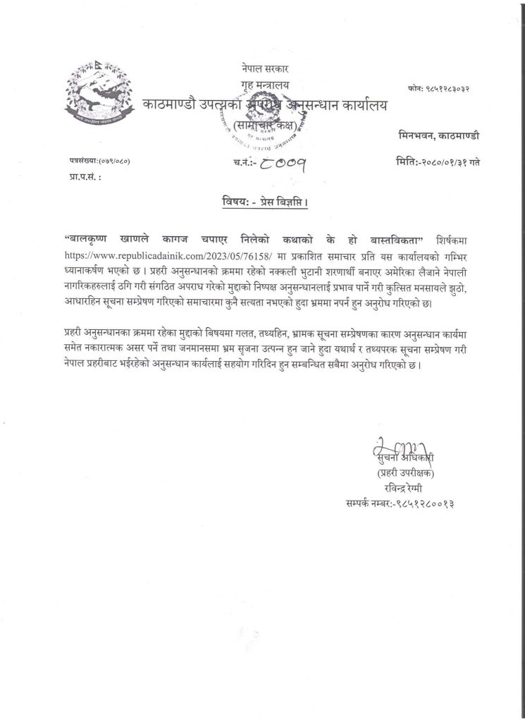 अपराध कार्यालयका सूचना अधिकारी तथा प्रहरी उपरीक्षक रविन्द्र रेग्मीले आइतबार विज्ञप्ति जारी गरेर रिपब्लिका दैनिकमा प्रकाशित ‘बालकृष्ण खाणले कागज चपाएर निकालेको कथाको के हो बास्तविकता’शीर्षकको समाचारको खण्डन गरेका हुन् ।