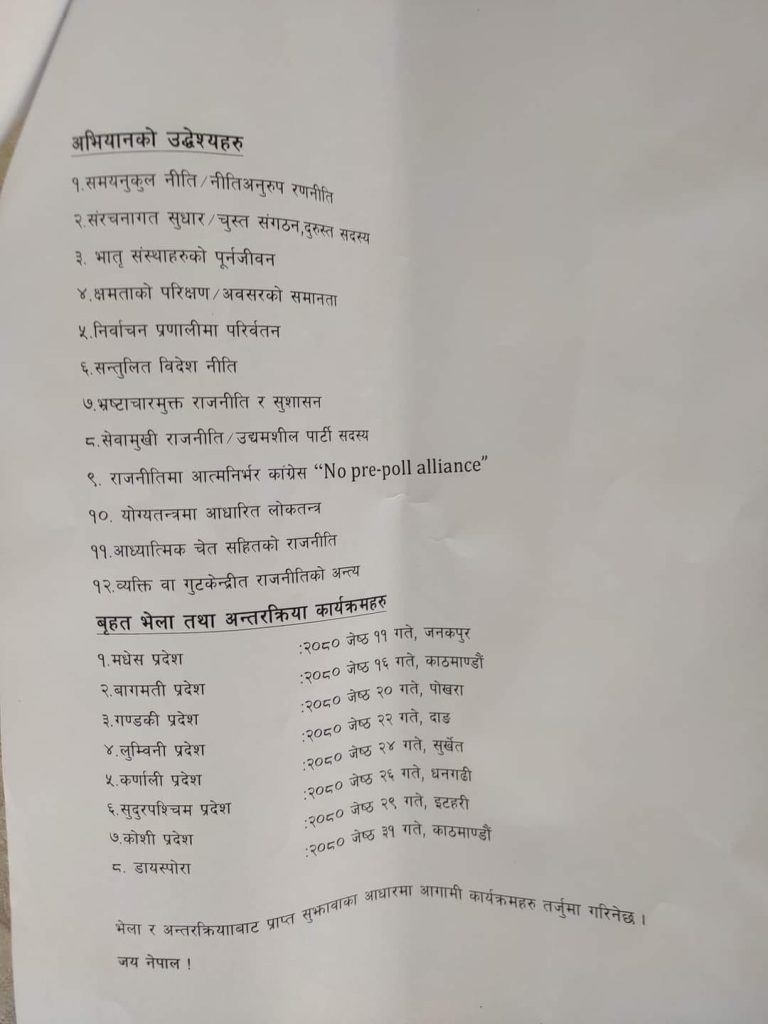 घण्टी कांग्रेसका नेताहरूले भनेका छन्, ‘अब कांग्रेसले आफ्नो इतिहासलाई साक्षी राखेर नयाँ कांग्रेस निर्माण गर्नुपर्छ, कांग्रेस रूपान्तरणको अभियानलाई अगाडि बढाउनुपर्ने टड्कारो अवश्यकता यही हो ।’