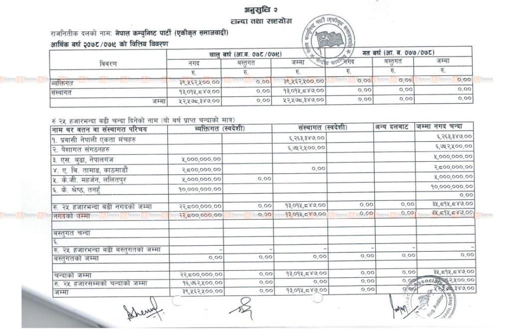 नेकपा (एकीकृत समाजवादीले २५ हजारभन्दा धेरै चन्दा दिने दाताको नाम र रकम आफ्नो लेखापरीक्षण प्रतिवेदनमा समावेश गरेको छ । धेरै रकम चन्दा दिन दाताहरूको नाम लुकाइएको छ ।