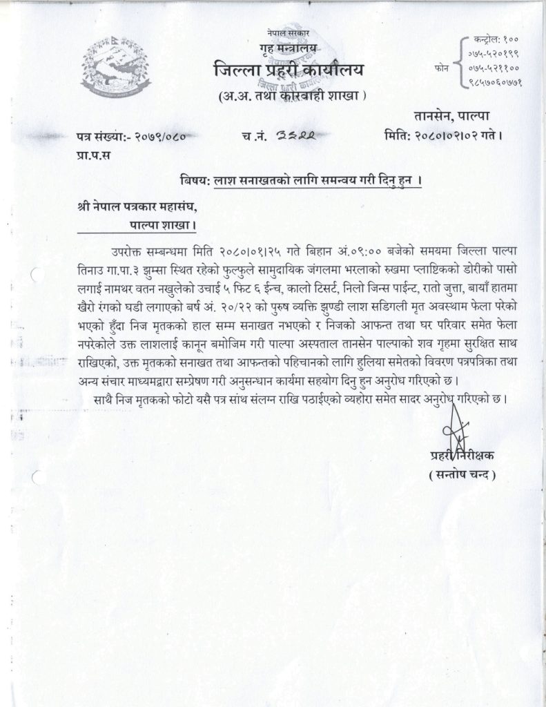 प्रहरीले शवको पहिचान गर्न सम्बन्धित पक्ष सबैसँग अनुरोध गरेको छ । प्रहरीले शवलाई वैशाख २४ गते बिहान ९ बजे फेला पारेको थियो । शवको सनाखत हुन नसकेपछि तस्वीर र हुलिया सार्वजनिक गरेको छ ।
