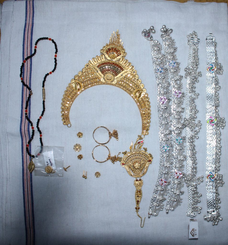सुनको जस्तो देखिने पहेलो धातुको (ॐ) लेखेको लकेट तौल गर्दा ०.५६ ग्रामको थान १, चाँदी जस्तो देखिने सेतो धातुको पायल तौल गर्दा १४३ ग्राम थान २ र चाँदी जस्तो देखिने सेतो धातुको खुट्टामा लगाउने पायल तौल गर्दा १०० ग्राम थान २ पनि बरामद भएको छ ।