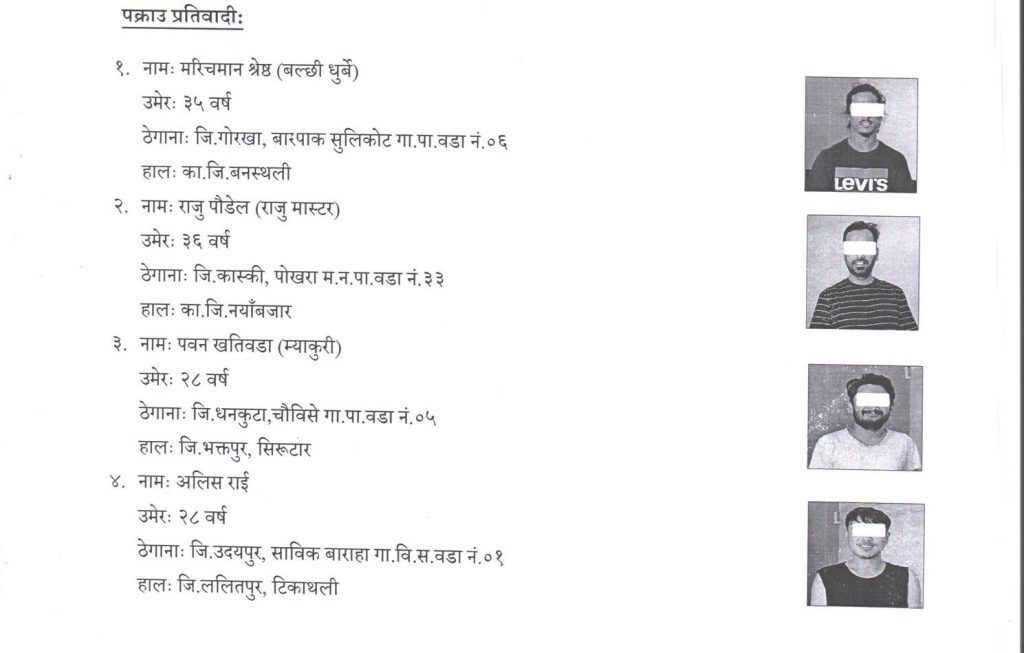 मुगुको छायानाथ रारा नगरपालिका–५ घर भई ललितपुरको टीकाथली बस्ने १९ वर्षीय गणेश देवकोटा ‘गणेश जिडी’, मोरङको विराटनगर महानगरपालिका–५ घर भई भक्तपुरको ठिमी बस्ने २५ वर्षीय सरोज घिमिरे