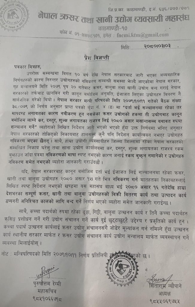 अन्यथा असार १६ गते देखि देशभरिका सम्पूर्ण क्रसर, खानी तथा वालुवा उद्योगहरूको बिक्री तथा उत्पादन कार्य ठप्प गरी अनिश्चित कालको लागि क्रसरहरू बन्द गर्ने बताए ।