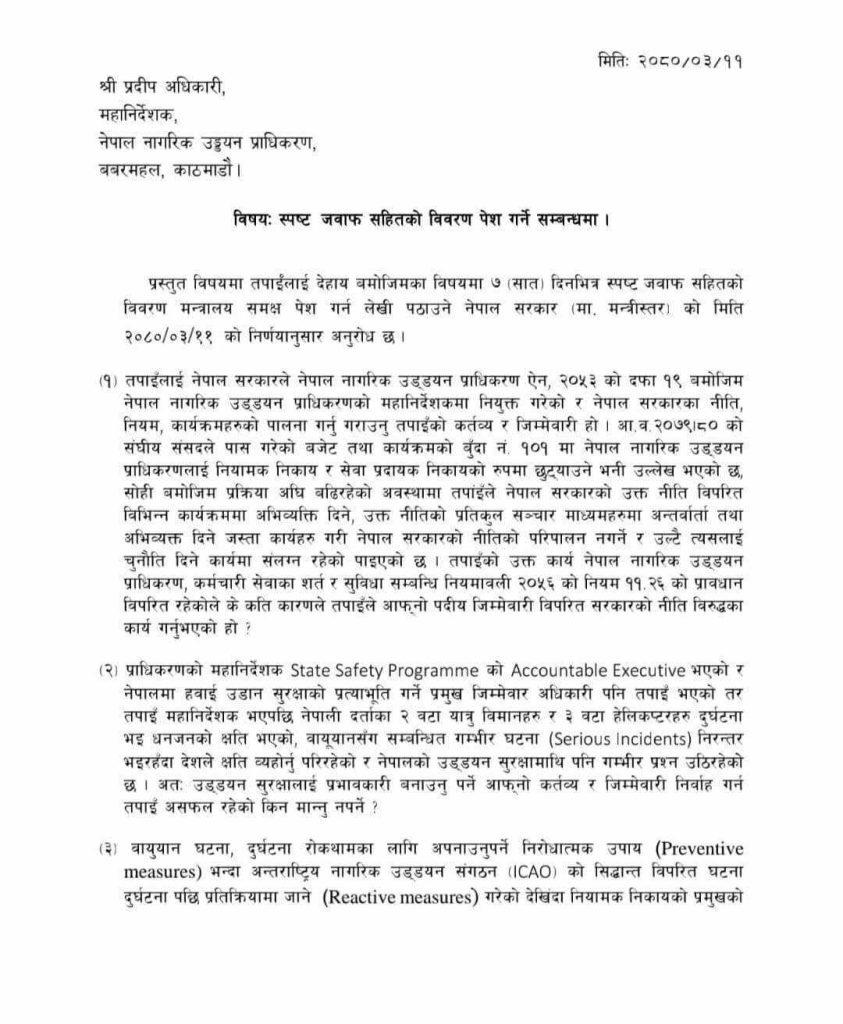 ‘मिति २०७९ पुष १७ गते पोखरा अन्तर्राष्ट्रिय विमानस्थल उद्घाटनको दिन तपाईंको आदेशमा पोखरा विमानस्थलको समाप्त भइसकेपछि पनि विपरित विभिन्न वायुसेवा कम्पनीका ५ वटा उडान गराइएको पाइयो । नियामक निकायको प्रमुखको हैसियतले यस्तो कार्यलाई रोक्नु पर्नेमा उडान सुरक्षामा प्रतिकुल असर गर्ने चरम लापरवाहीपूर्ण कार्य किन र कसरी हुन गएको हो ?’