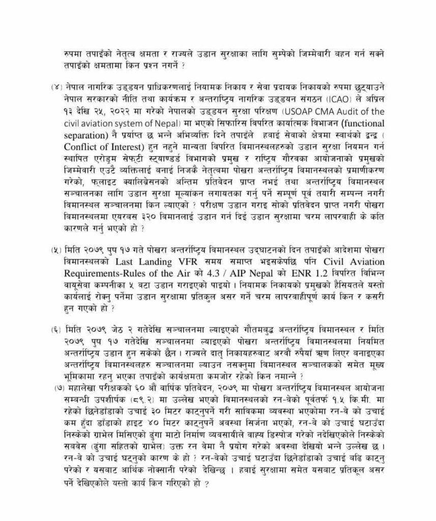 ‘नेपाल नागरिक उड्डयन प्राधिकरणलाई नियामक निकाय र सेवा प्रदायक निकायको रूपमा छुट्याउने नेपाल सरकारको नीति तथा कार्यक्रम र अन्तराष्ट्रिय नागरिक उड्डयन संगठनले अप्रिल १३ देखि २५, २०२२ मा गरेको नेपालको उड्डयन सुरक्षा परीक्षणमा भएको सिफारिस विपरित कार्यात्मक विभाजन नै प्रर्याप्त छ भन्ने अभिव्यक्ति दिने तपाइले हवाई सेवाको क्षेत्रमा स्वार्थको द्वन्द्व हुन नहुने मान्यता विपरित विमानस्थलहरूको उडान सुरक्षा नियमन गर्न स्थापित एरोड्रम सेफ्टी स्ट्याण्डर्ड विभागको प्रमुख र राष्ट्रिय गौरवका आयोजनाको प्रमुखको जिम्मेवारी एउटै व्यक्तिलाई बनाई निजकै नेतृत्वमा पोखरा अन्तर्राष्ट्रिय विमानस्थलको प्रमाणीकरण गरेको, फ्लाइट क्यालिब्रेसनको अन्तिम प्रतिवेदन प्राप्त नभई तथा अन्तर्राष्ट्रिय विमानस्थल सञ्चालनका लागि उडान सुरक्षा मूल्यांकन लगायतका गर्नु पर्ने सम्पूर्ण पूर्व तयारी सम्पन्न नगरी विमानस्थल सञ्चालनमा किन ल्याएको परीक्षण उडान गराइ सोको प्रतिवेदन प्राप्त नगरी पोखरा विमानस्थलमा एयरबस ३२० विमानलाई उडान गर्न दिई उडान सुरक्षामा चरम लापरवाही के कति कारणले गर्नु भएको हो ?’