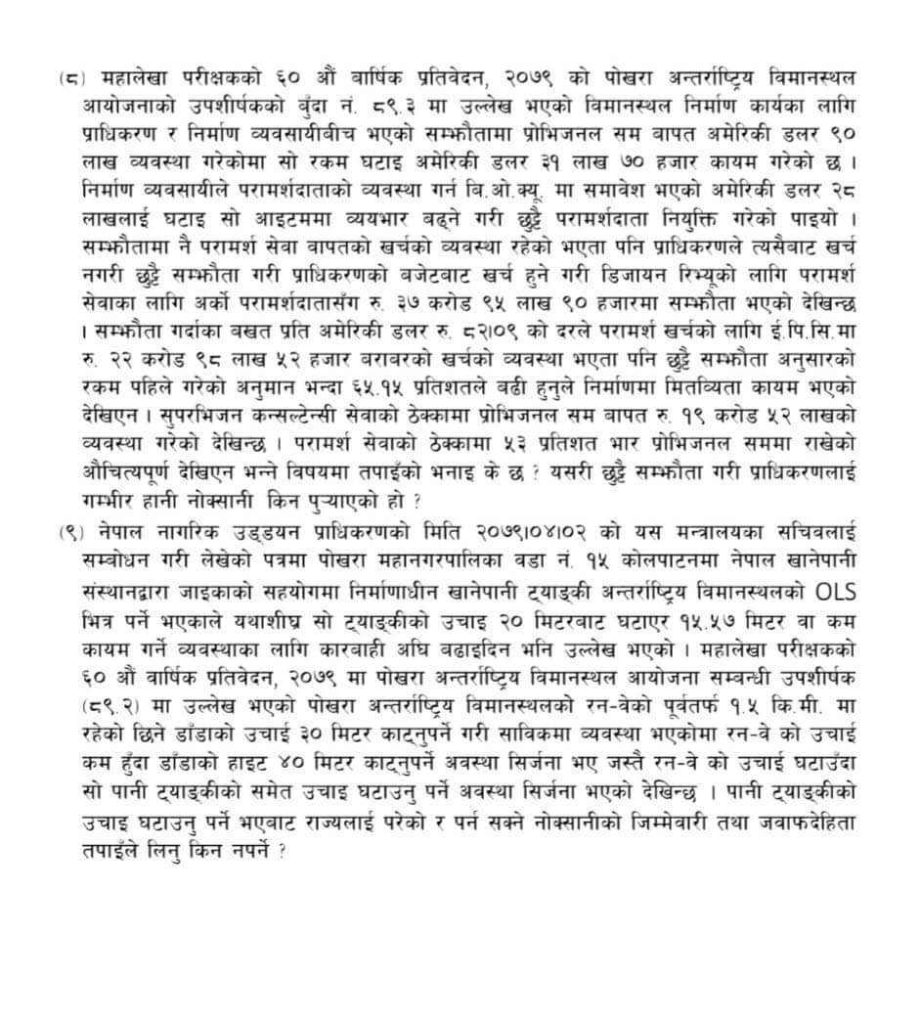‘महालेखा परीक्षकको ६० औं वार्षिक प्रतिवेदन २०७९ को पोखरा अन्तर्राष्ट्रिय विमानस्थल आयोजनाको उपशीर्षकको बुँदा नं. ८९३ मा उल्लेख भएको विमानस्थल निर्माण कार्यका लागि प्राधिकरण र निर्माण व्यवसायीबीच भएको सम्झौतामा प्रोभिजनल सम वापत अमेरिकी डलर ९० लाख व्यवस्था गरेकोमा सो रकम घटाइ अमेरिकी डलर ३१ लाख ७० हजार कायम गरेको छ । निर्माण व्यवसायीले परामर्शदाताको व्यवस्था गर्न वि. ओ. क्यू. मा समावेश भएको अमेरिकी डलर २८ लाखलाई घटाइ सो आइटममा व्ययभार बढ्ने गरी छुट्टै परामर्शदाता नियुक्ति गरेको पाइयो । सम्झौतामा नै परामर्श सेवा वापतको खर्चको व्यवस्था रहेको भएता पनि प्राधिकरणले त्यसैबाट खर्च नगरी छुट्टै सम्झौता गरी प्राधिकरणको बजेटवाट खर्च हुने गरी डिजायन रिभ्यूको लागि परामर्श सेवाका लागि अर्को परामर्शदातासँग रू. ३७ करोड ९५ लाख ९० हजारमा सम्झौता भएको देखिन्छ । सम्झौता गर्दाका बखत प्रति अमेरिकी डलर रु. ८२००९ को दरले परामर्श खर्चको लागि ई.पि.सि.मा रु. २२ करोड ९८ लाख ५२ हजार बराबरको खर्चको व्यवस्था भएता पनि छुट्टै सम्झौता अनुसारको रकम पहिले गरेको अनुमानभन्दा ६५.१५ प्रतिशतले बढी हुनुले निर्माणमा मितव्यिता कायम भएको देखिएन । सुपरभिजन कन्सल्टेन्सी सेवाको ठेक्कामा प्रोभिजनल सम वापत रू. १९ करोड ५२ लाखको व्यवस्था गरेको देखिन्छ । परामर्श सेवाको ठेक्कामा ५३ प्रतिशत भार प्रोभिजनल सममा राखेको औचित्यपूर्ण देखिएन भन्ने विषयमा तपाईंको भनाइ के छ ? यसरी छुट्टै सम्झौता गरी प्राधिकरणलाई गम्भीर हानी नोक्सानी किन पुर्‍याएको हो ?’, स्पष्टीकरणमा सोधिएको छ ।