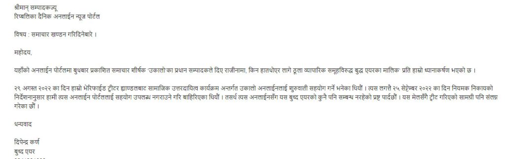 प्रवक्ता कर्णले मेलमार्फत अनौपचारिक खण्डन पठाएर भनेका छन्, ‘यहाँको अनलाईन पोर्टलमा बुधबार प्रकाशित समाचार शीर्षक ‘उकालो’का प्रधान सम्पादकले दिए राजीनामा, किन हातधोएर लागे ठूला व्यापारिक समूहविरुद्ध बुद्ध एयरका मालिक’प्रति हाम्रो ध्यानाकर्षण भएको छ ।’