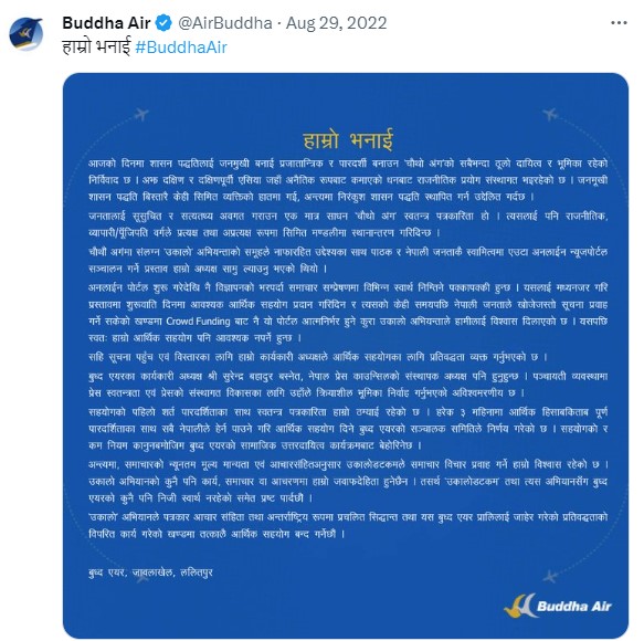 बुद्ध एयरको ट्वीटरमा अगस्ट २९, २०२२ मा प्रकाशित एउटा सूचनालाई हाम्रो भनाइ भनेर कर्णले मेल गरेका छन् । रिपब्लिका दैनिकले बुद्ध एयरका मालिक तथा कार्यकारी अध्यक्ष बस्नेतले नाम चलेका ठूला व्यापारिक समूहविरुद्ध आफैले लगानी गरेको ‘उकालो’ वेबपोर्टलबाट समाचार लेखाएर ध्वस्त बनाउन खोजेको भनेर समाचार प्रकाशित गरेको थियो ।