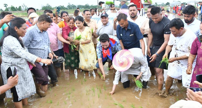 ओलीले सुरुमा केहीबेर हिलाम्मे खेतमा धान रोप्ने मेसिन चलाएका थिए । मेसिनबाट ओर्लेर ओलीले एमालेका नेता/कार्यकर्तासँगै केहीबेर हातैले धान पनि रोपेका थिए ।