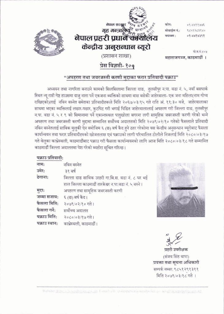 काठमाडौं । नेपाल प्रहरीको केन्द्रीय अनुसन्धान व्यूरो (सीआईबी)ले अपहरण तथा जबरजस्ती करणी मुद्दाका फरार प्रतिवादी ३१ वर्षीय नविन बस्नेतलाई पक्राउ गरेको छ ।