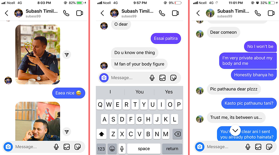 महिलाले पोष्ट गरेको स्क्रिनसटमा तिमिल्सिनाले आफू ती महिला प्रहरीको शरीरको फ्यान भएको, फोटो पठाउन अनुरोध गरेका लगायत म्यासेज छन् ।