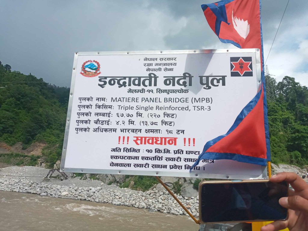 मेलम्ची । स्वास्थ्य तथा जनसंख्यामन्त्री मोहनबहादुर बस्नेतले सिन्धुपाल्चोक जिल्लाको मेलम्ची बजारस्थित ईन्द्रावती खोलामा बेलिबृजको उद्घाटन गरेका छन् ।