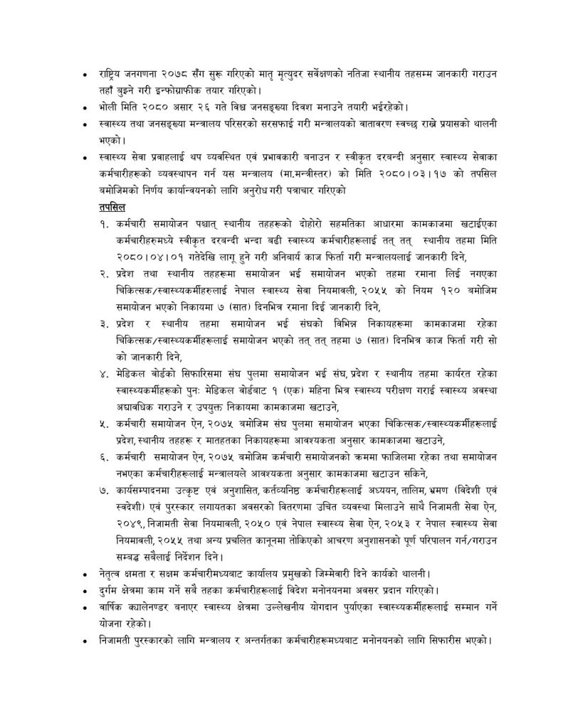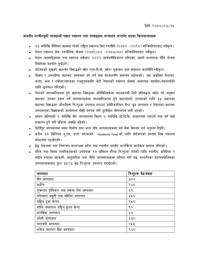 उनले १६ वर्षदेखि नीगित बहसमा रहेको राष्ट्रिय स्वासथ्य वित्त रणनीति (२०८०—२०९०) मन्त्रिपरिषद्बाट स्वीकृत भएको, नेपाल स्वास्थ्य क्षेत्र रणनीतिक योजना २०७९/८०—२०८७/८८) मन्त्रिपरिषद्बाट स्वीकृत भएको, नेपाल जनसांख्यिक तथा स्वास्थ्य सर्वेक्षण, २०२२ सार्वजनिक गरेको लगायतका कुरा आफूले गरेका काम कारवाहीको सूचीमा समेटेका छन् ।