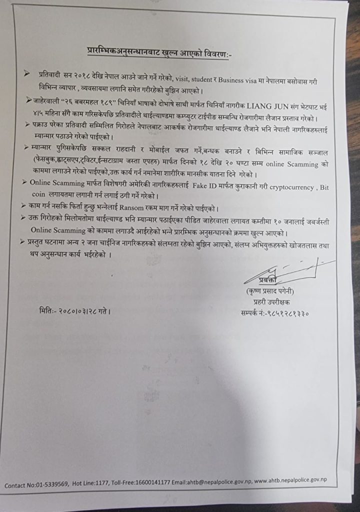 गिरोहले थाइल्यान्डमा आकर्षक रोजगारी पाउने भन्दै नेपाली नागरिकलाई प्रलोभन देखाउने र म्यान्मार पुर्‍याउने गरेको पीडितको भनाइ छ ।