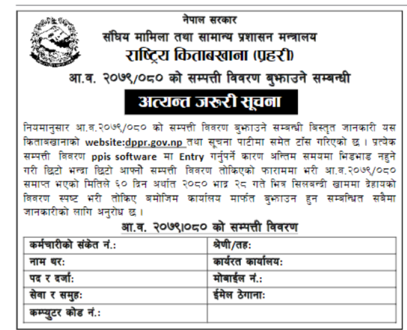 संघीय मामिला तथा सामान्य प्रशासन मन्त्रालय राष्ट्रिय किताब खाना प्रहरी सूचना जारी गर्दै सम्पत्ति विवरण बुझाउन भनेको हो ।