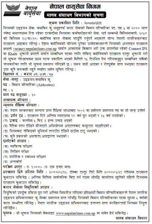 निगमको उड्डयन सेवा, क्याबिन क्रू समूहतर्फ करार सेवाको विमान परिचारिका रिक्त ३० पदका लागि दरखास्त आह्वान गरेको सूचनामा उल्लेख छ ।