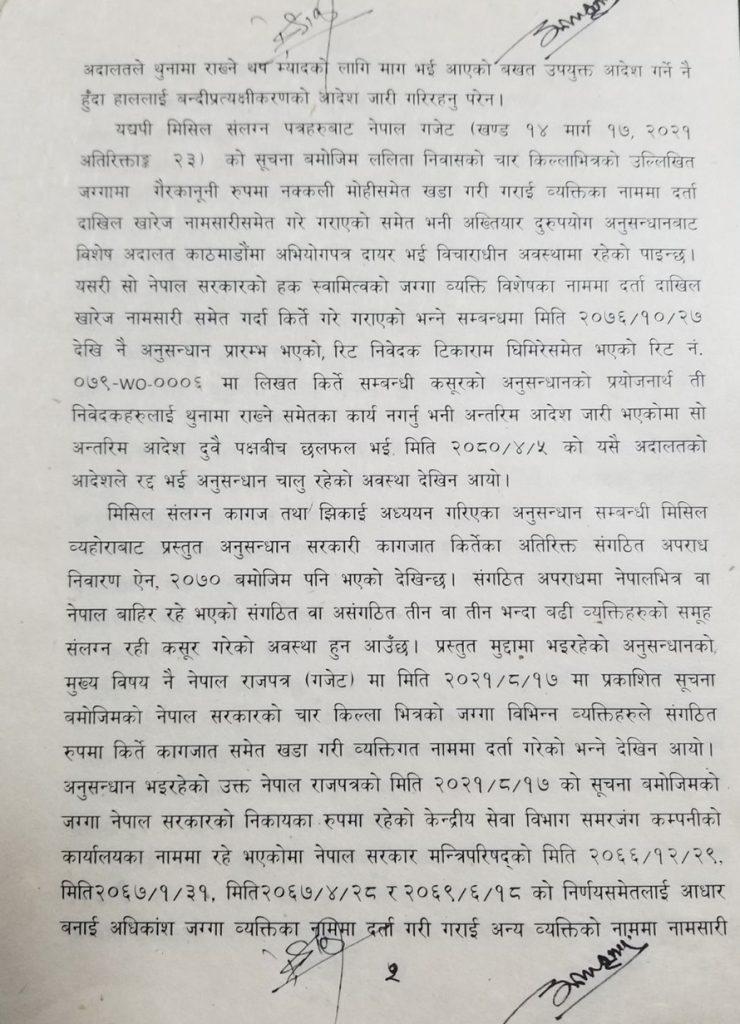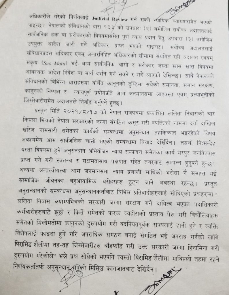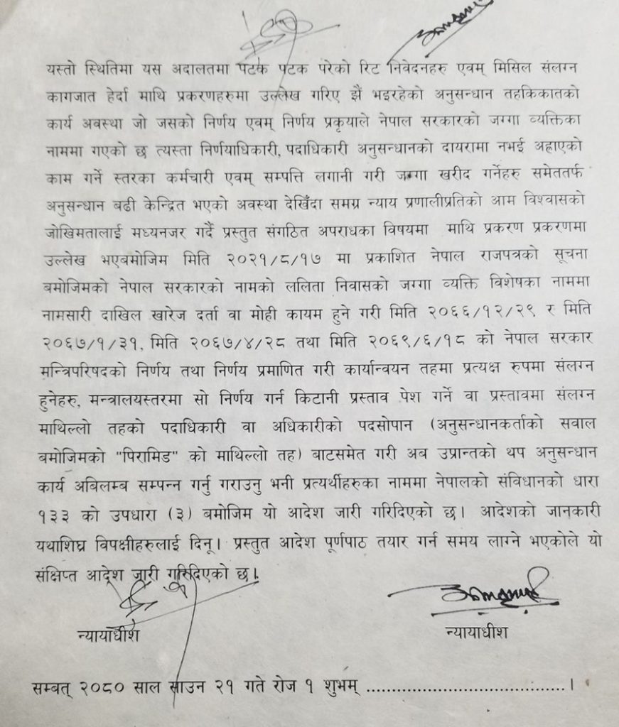 ‘नेपाल राजपत्रको सूचना बमोजिमको नेपाल सरकारको नामको ललिता निवासको जग्गा व्यक्ति विशेषका नाममा नामसारी दाखिल खारेज दर्ता वा मोही कायम हुने गरी मिति २०६६/१२/२९ र मिति २०६७/१/३१, मिति २०६७/४/२८ तथा मिति २०६९/६/१८ को नेपाल सरकार मन्त्रिपरिषदको निर्णय तथा निर्णय प्रमाणित गरी कार्यान्वयन तहमा प्रत्यक्षरूपमा संलग्न हुनेहरू, मन्त्रालयस्तरमा सो निर्णय गर्न किटानी प्रस्ताव पेश गर्ने वा प्रस्तावमा संलग्न माथिल्लो तहको पदाधिकारी वा अधिकारीको पदसोपान (अनुसन्धानकर्ताको सवाल बमोजिमको पिरामिडको माथिल्लो तह) बाटसमेत गरी अब उप्रान्तको थप अनुसन्धान कार्य अबिलम्ब सम्पन्न गर्नु गराउनु भनी प्रत्यर्थीहरूका नाममा नेपालको संविधानको धारा १३३ को उपधारा (३) बमोजिम यो आदेश जारी गरिदिएको छ’, संक्षिप्त आदेशमा भनिएको छ ।