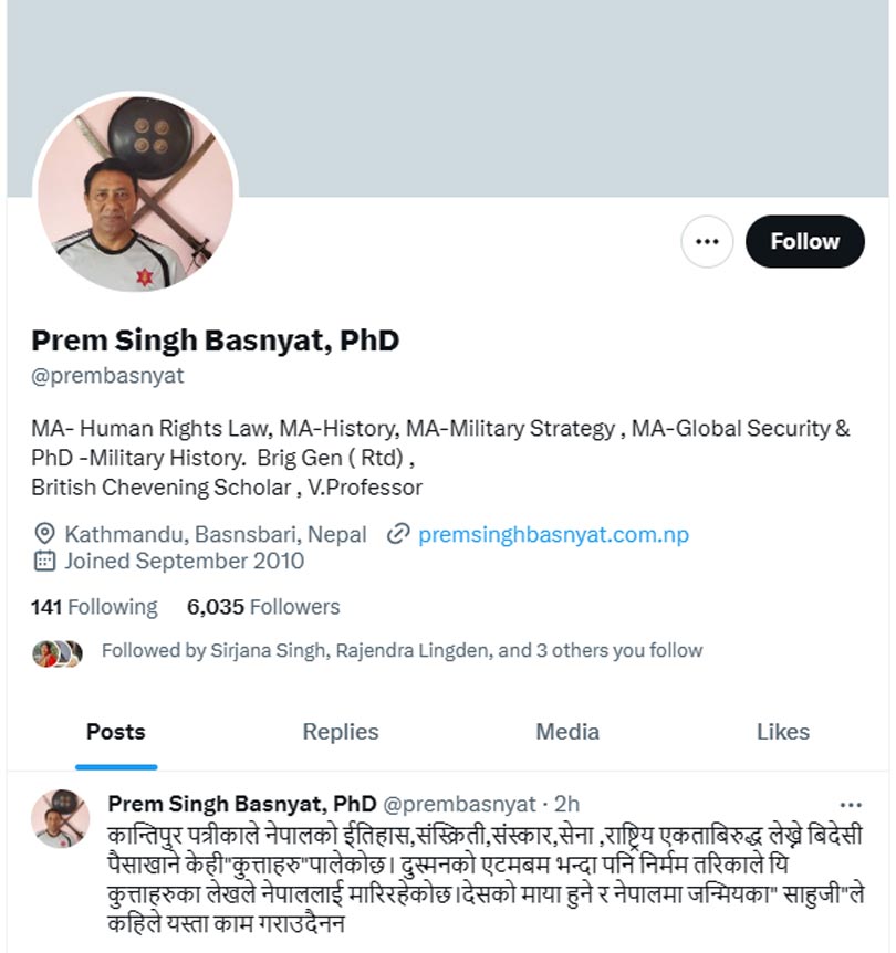 कान्तिपुर दैनिकले विदेशी कुत्ताहरू पालेको छ : पूर्व बिग्रेडियर जर्नेल बस्न्यात
