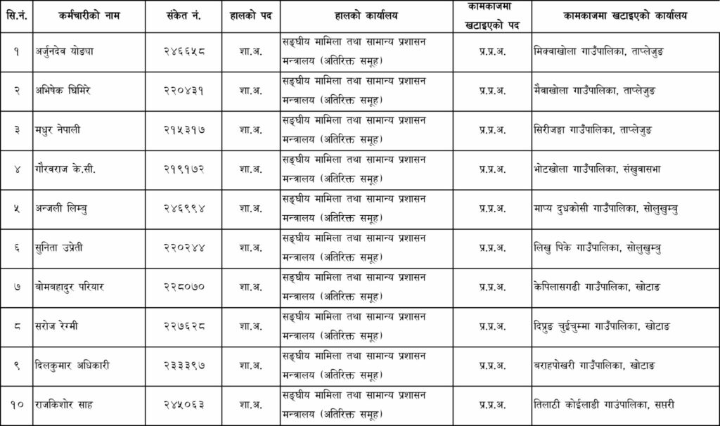 उनीहरूलाई मन्त्रालयले गाउँपालिकामा खटाएको छ । कर्मचारी प्रशासन महाशाखाले नयाँ नियुक्त भएका, ६ महिना तालिम सकेका शाखा अधिकृतहरूलाई गाउँपालिकाको प्रमुख प्रशासकीय अधिकृतका रुपमा खटाएको छ ।