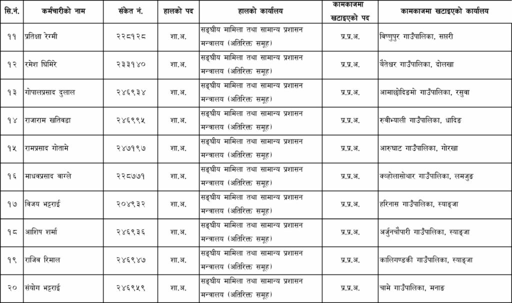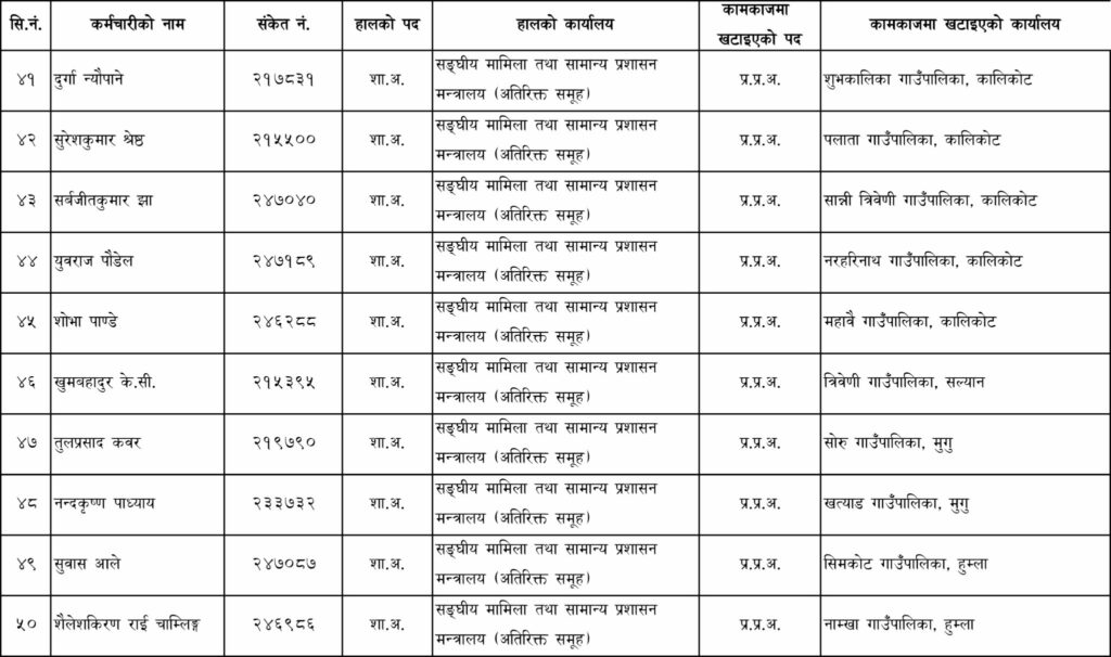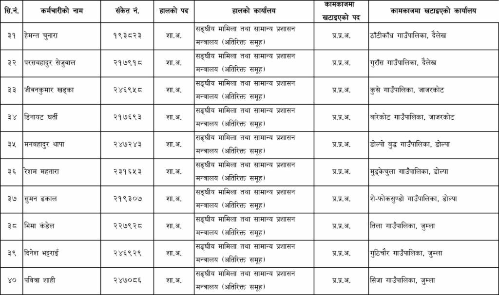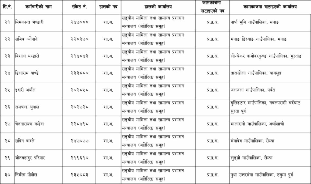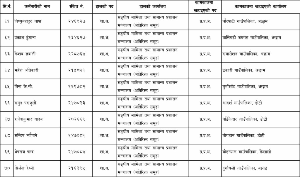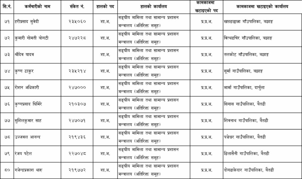 काठमाडौं । संघीय मामिला तथा सामान्य प्रशासन मन्त्रालयले ८० जना शाखा अधिकृतहरूको सरुवा गरेको छ ।